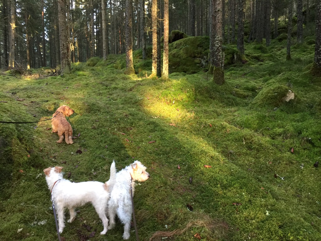 Man ser väldigt tydligt att han vill lyssna och ta till sig det man frågan av honom men markerar tydligt om han inte är okej eller blir förvirrad. Något jag uppskattar då jag kan rätta till mig. Den delen av hans personligthet jag såg idag gjorde hela han väldigt ståtlig och vacker i mina ögon” som avslutning på dagen gick vi en mysig skogspromenad med hundarna. Underbart med granar, tallar och mossa.