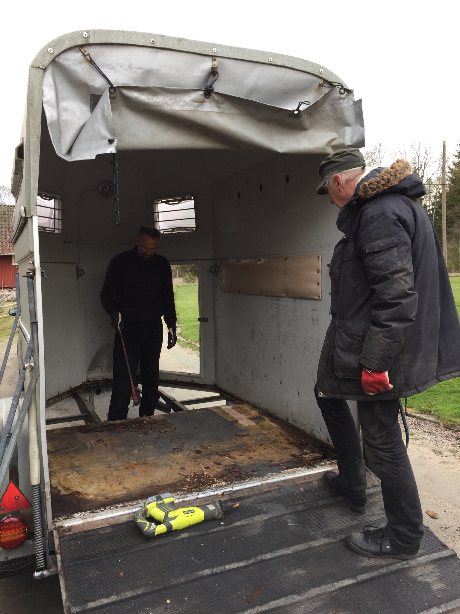 Byte av golv, välbehövligt helt klart. Tur jag aldrig kört någon häst i denna transport.