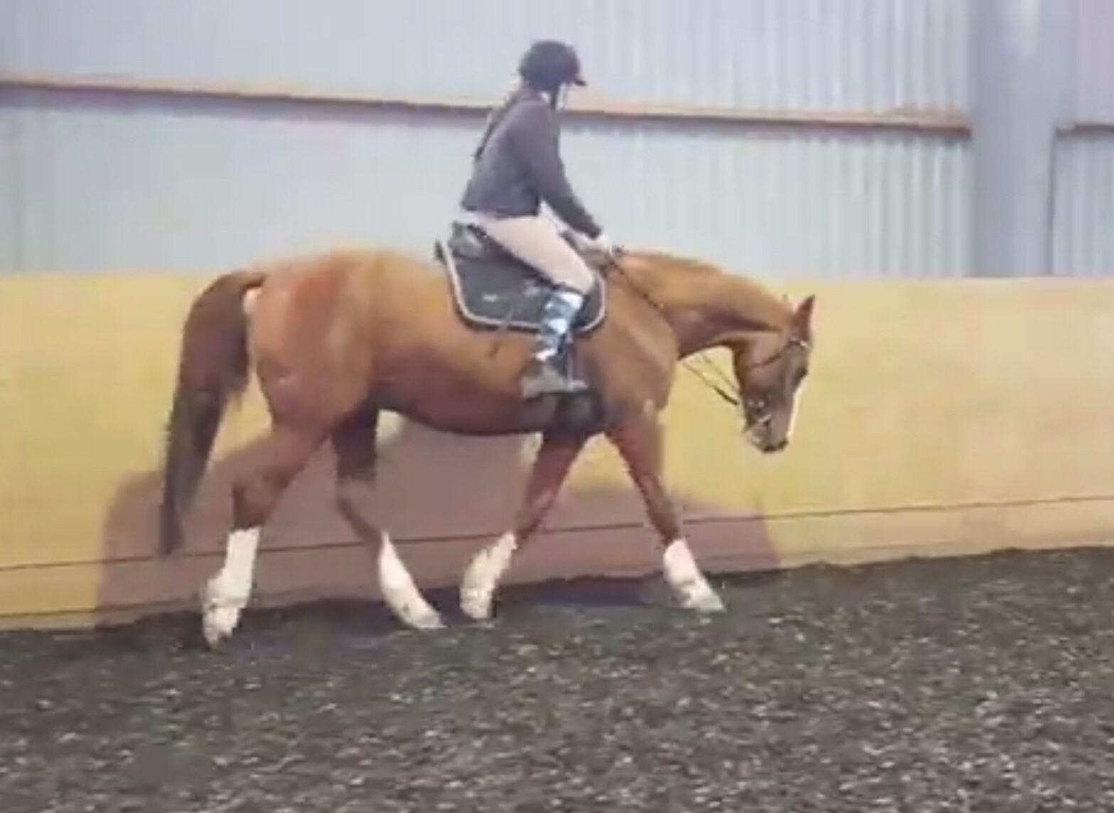Diego har inte så lätt för att slappna av och det som händer är att han blir trippig och kort i steget. Med denna träning vi gjort så han han nu kunna börja ta ut steglängden, välva sig bättre, få en sundare form och även kunnat sänka sig så pass så han börjat kunna söka sig framåt neråt korta stunder. Han har lite kort och spänd överlinjen och behöver tänja den och få upp mer rygg och bättre bukmuskulatur.